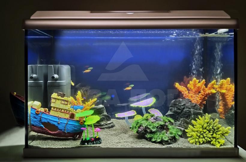 Офомление небольшого аквариума (объемом 70 литров) выполнено в подарок ко дню рождения 5-летнего мальчика. Декорации для аквариума оформитель Валерия Рыженкова выбирала вместе с его будущим хозяином, увлеченным пиратами Карибского моря. Поэтому в аквариуме разместился затонувший фрегат и выросли коралловые заросли. Живое население - красные неоны и яркие данио изображают обитателей морского рифа.
