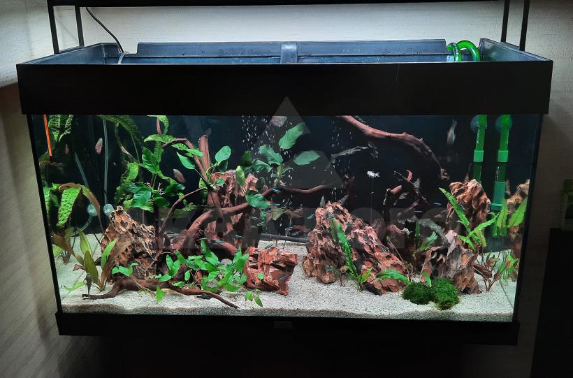 В качестве крупных камней выбрали натуральный камень «Дракон». Обитателями аквариума стали красные неоны, сомы и лялиусы.