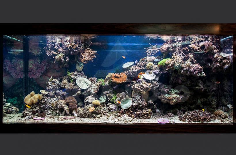 Морской рифовый аквариум с жесткими кораллами. Аквариум с облицовкой изготовлены на производстве "АКва Лого". Аквариумный комплекс был представлен в салоне "Аква Лого" на улице Академика Анохина. В 2020 году салон переехал по новому адресу: Москва, ул. Молодёжная, д. 4. В салоне можно увидеть новый морской аквариум с рифовым оформлением.