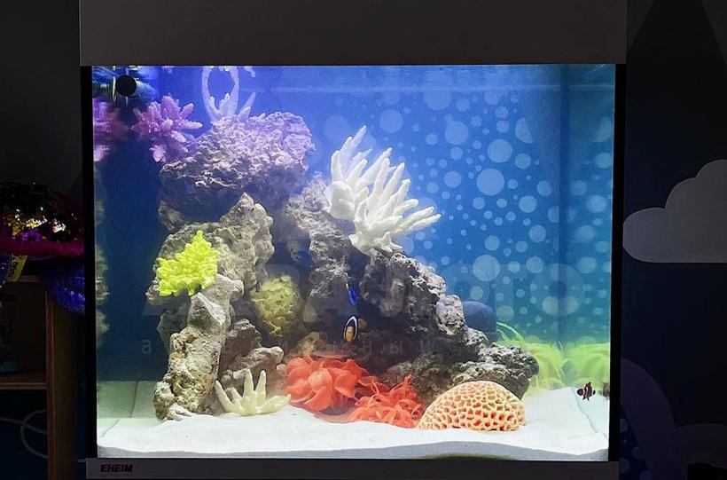 В детской комнате у двух маленьких хозяек появилось маленькое море. Аквариум объемом 230 литров производства Eheim. Основа композиции - горка из живых камней. Камни перевозятся во влажном состоянии и сохраняют на своей поверхности микробиом, создающий настоящую морскую экосистему. Разнообразили пейзаж цветные имитации кораллов. Фоном для аквариума стал рисунок на обоях за аквариумом, который напоминает блестящие пузырьки в воде.
