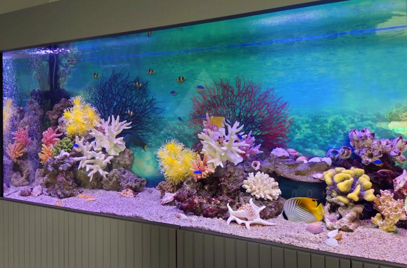 В Облицовка из МДФ под покраску и баннер были изготовлены на нашем производстве. В оформлении использованы живые камни, имитации кораллов и натуральные раковины.