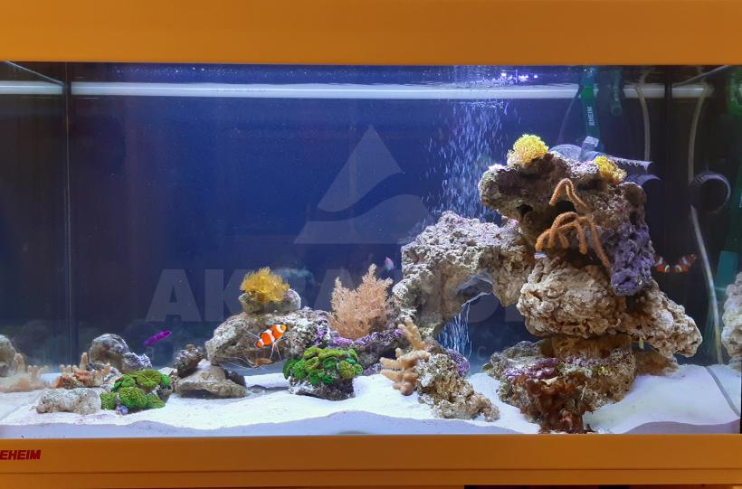 Морская вода в этом мягком минирифе приготовлена не на основе осмоса, а с использованием простой водопроводной воды. Для аквариума выбрали синулярию ушастую, капнеллу, паразоантусы, политою грин, клавулярию и горгонарию. Они хорошо себя чувствуют в такой морской воде при минимальной замене стандартного освещения из комплекта оборудования. В аквариуме Eheim Vivaline 126 живут два клоуна оцелляриса, хирург королевский голубой, губан пижама, ложнохромис Фридмана и две креветки-доктор тихоокеанских.