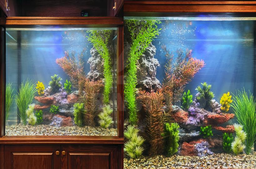 В классическом интерьере идеально смотрятся растительные пейзажи, создается впечатление старинного аквариума. Но есть одно НО - карпы являются растительноядными рыбами и не уживаются с живыми растениями. Наш специалист создал гармоничную картину растительного пейзажа, используя только пластиковые растения.