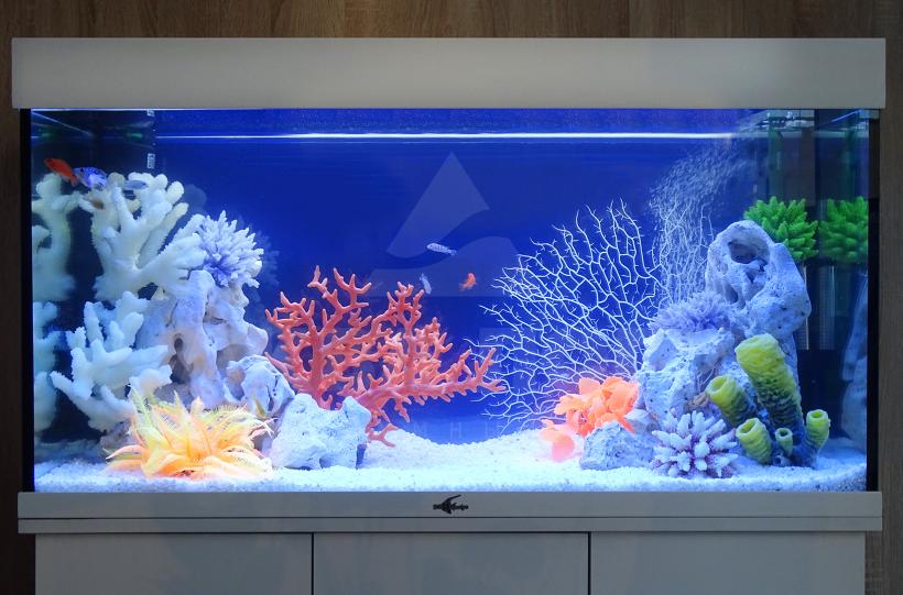 Оформление выполнено в аквариуме Биодизайн Риф 200 объемом 185 литров, цвет отделки аквариума и тумбы - белый. Стиль оформления «Псевдоморе».