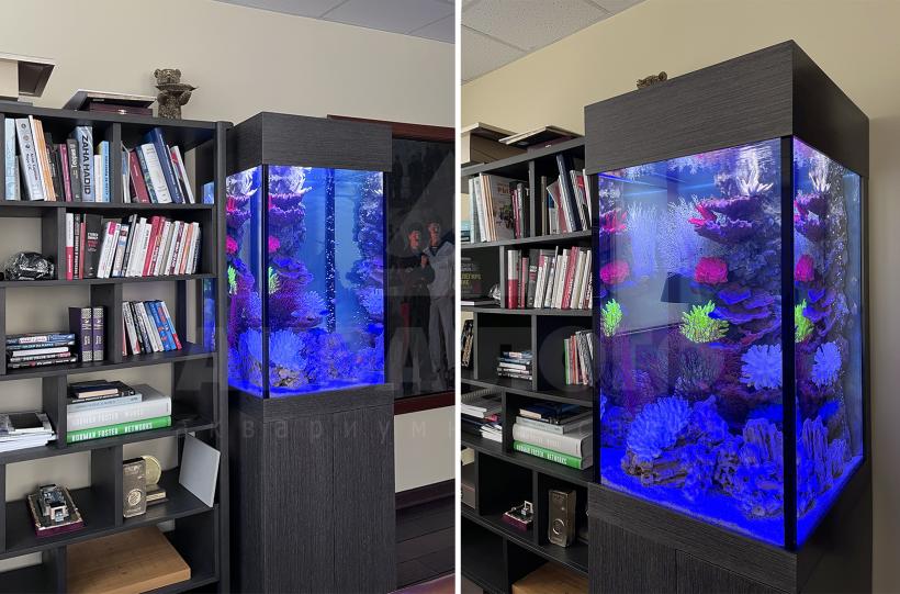 Прямоугольный аквариум объемом 360 литров изготовлен на собственном производстве салона. В соответствии с пожеланиями заказчика цвет отделки был подобран под цвет мебели в кабинете.
