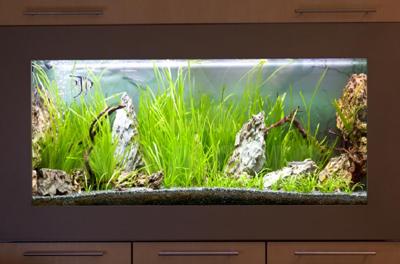 Пресноводное оформление с живыми растениям в аквариуме, встроенном в мебельный гарнитур