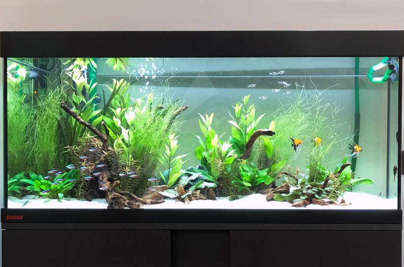 Пресноводное оформление с живыми растениями, неонами и скаляриями в аквариуме Eheim объемом 180 литров
