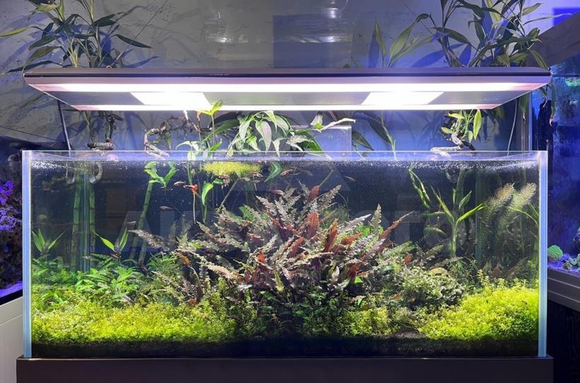 Для того, чтобы такое количество растений процветало, в аквариуме установлено специальное освещение. В компании с растениями живут несколько видов креветок: Амано, вишневые красные, и рыбы кардиналы и гуппи.
