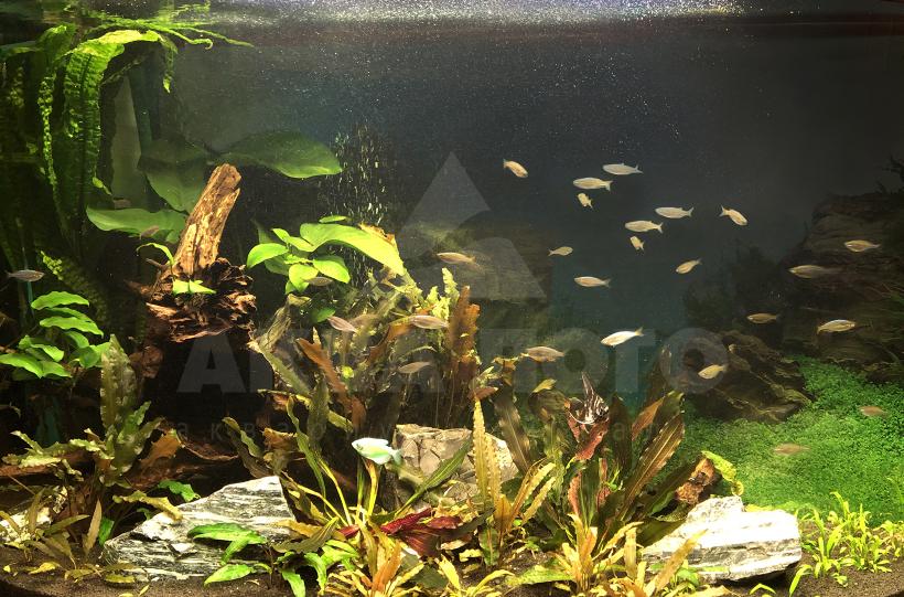 В панорамном аквариуме объемом 300 литров выполнено растительное оформление 2-й категории сложности. При создании композиции с растениями использованы аквариумные камни и натуральные коряги, живое население - радужницы и скалярии.