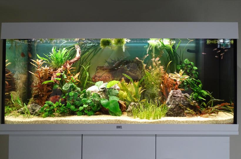 Этот прямоугольный аквариум Juwel RIO объемом 240 литров по живому населению стал преемником аквариума того же немецкого бренда, но меньшего объема. Нашим специалистом был создан совершенно новый подводный сад, в котором часть растений и рыба переехали из прежнего аквариума, но были дополнены новым живым населением.