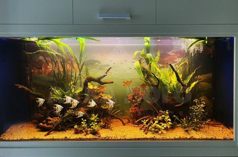 Это оформление стало обновлением дизайна аквариума спустя 5 лет. Художественная композиция из коряг и живых растений создала новое настроение, для динамики добавили стайных рыбок. В аквариуме появились тетры аманда, расборы и скалярии.