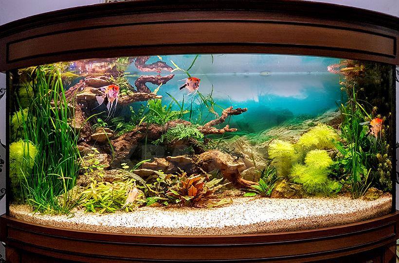 Пресноводное оформление с живыми растениями в панорамном аквариуме