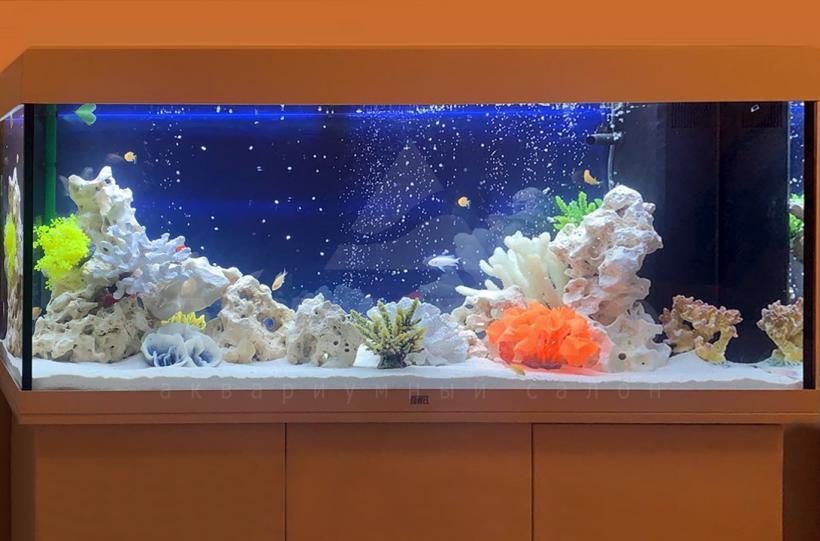 Натуральный и искуственный декор имитирует морское дно - белый коралловый песок, камни причудливой формы, яркие кораллы, при этом в аквариуме пресная вода.