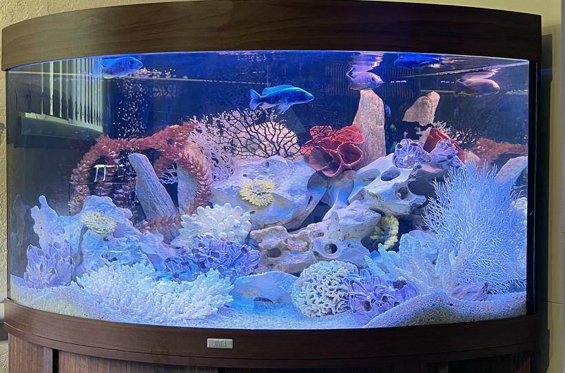 Автору оформления захотелось сделать цветовую палитру композиции классически светлой, с присутствием натуральных декораций и минимумом цветовых акцентов, чтобы в них не затерялись самые важные обитатели аквариума - васильковые хаплохромисы.