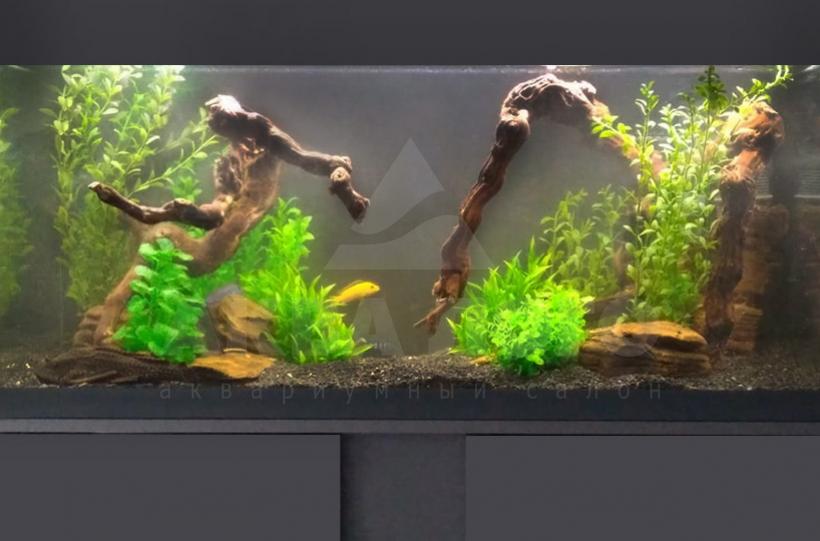 Пресноводный аквариум с искусственными растениями и цихловыми