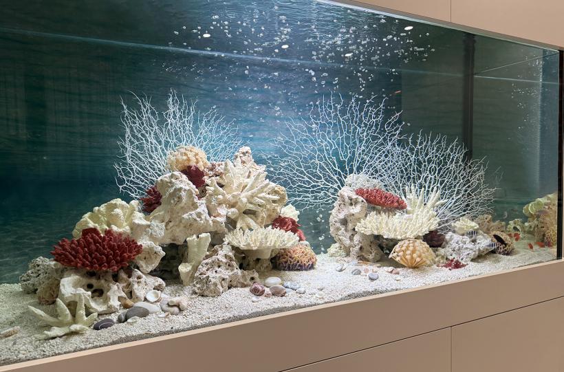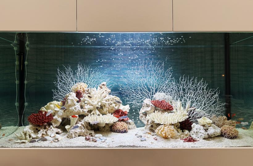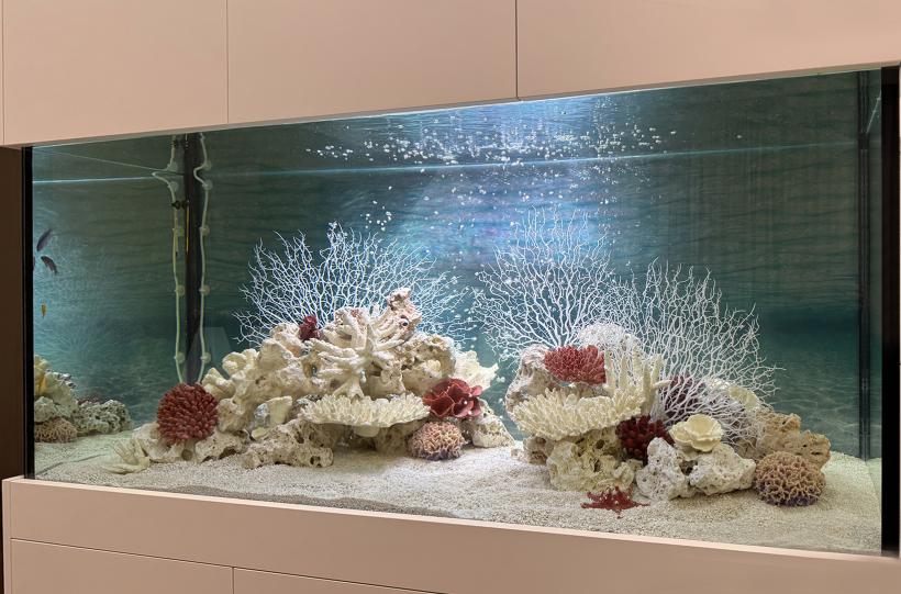 Псевдоморское оформление аквариума объемом 740 литров, встроенного в шкаф