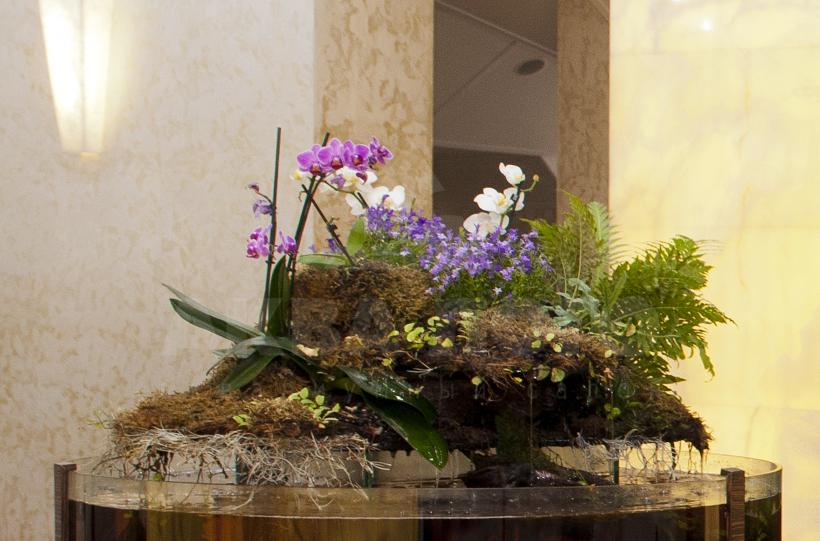Расположенная в центре зала водно-цветочная композиция позволяет посетителю наблюдать реальную границу надводного и подводного сада. Созерцание водоема в стиле Ваби куса благотворно влияет на психологическое состояние человека, способствует умиротворению, создает чувство внутренней гармонии.